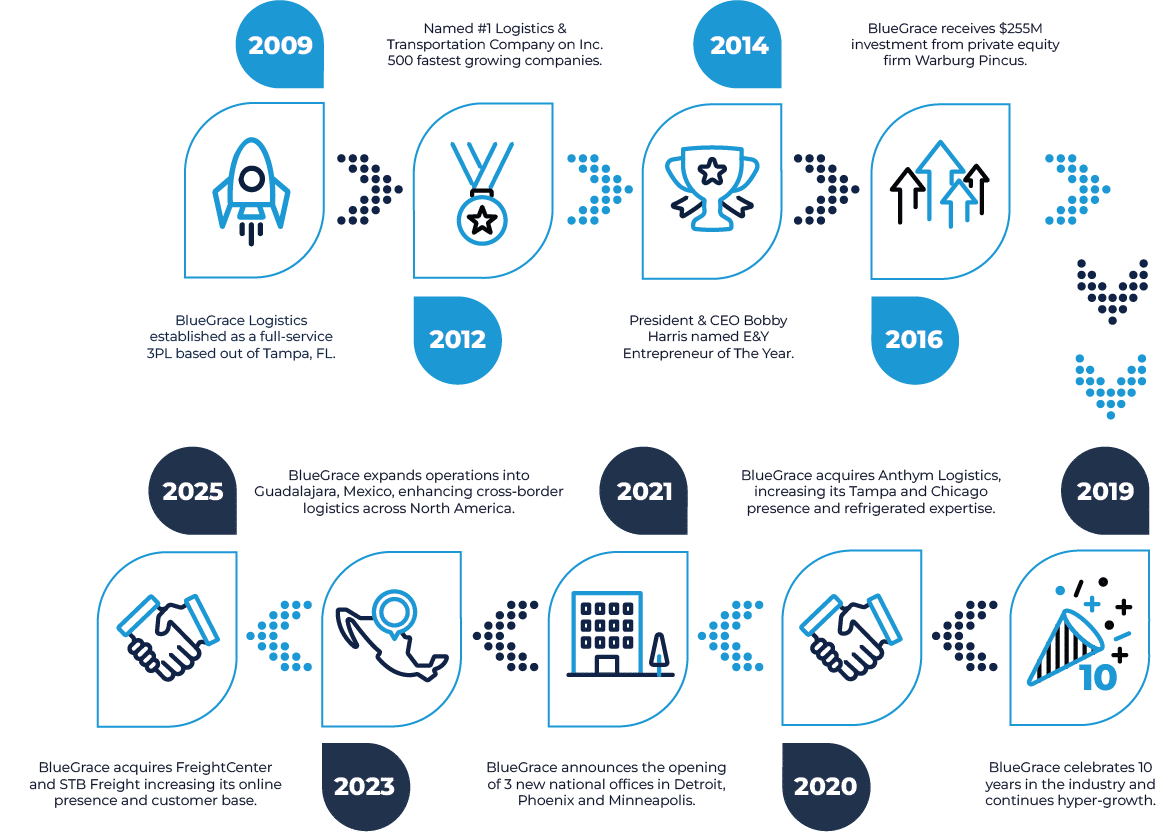 Since our founding in 2009, BlueGrace Logistics has grown into one of the most recognized names in third-party logistics. What started as a full-service 3PL based out of Tampa, FL has evolved into a national leader through strategic growth, industry recognition, and a relentless commitment to our customers. Explore the key moments that have shaped our journey and brought us to where we are today.