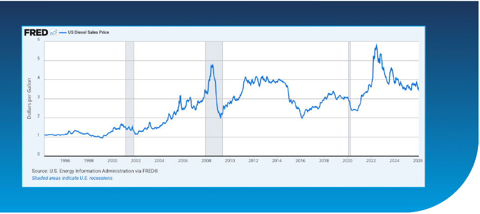 This chart reflects the national average diesel price paid by carriers. While fuel costs do not directly drive freight demand, they materially influence carrier cost structures and margin tolerance. Sustained increases in diesel prices compress margins and increase rate resistance, even in otherwise soft market conditions.