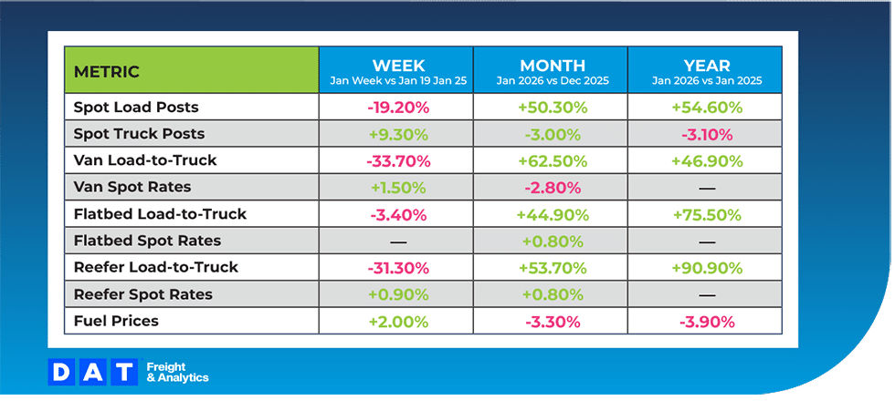 Early January normalization was interrupted by widespread winter weather across much of the U.S. east of the Rockies, temporarily reducing effective capacity and driving shippers back to the spot market. While load-to-truck ratios have eased sharply week over week across van, reefer, and flatbed equipment, all modes remain tighter relative to both last month and last year. Spot rates have softened modestly in the near term but continue to trend higher on a monthly basis, supported in part by short-term fuel price increases and ongoing recovery-related demand.