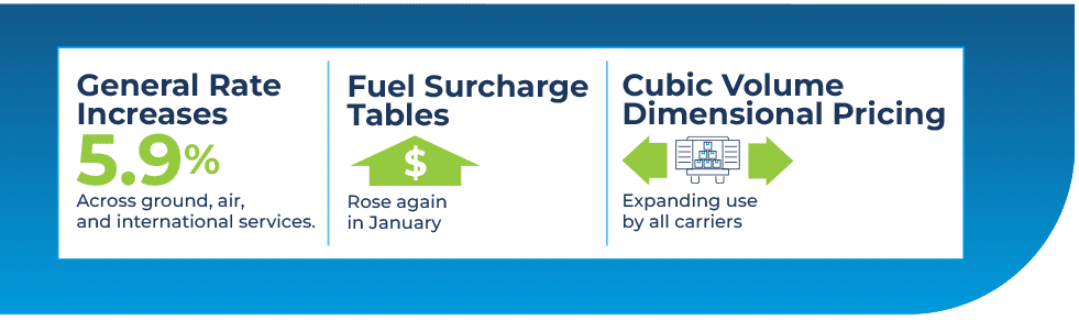 At the same time, pricing pressure continues to build beyond published rate increases. While 2026 GRIs average roughly 5.9 percent, actual costs are rising faster due to fuel surcharges, expanded accessorials, and stricter cubic volume and dimensional thresholds. Lightweight but bulky shipments are increasingly exposed to added handling and oversize fees, making packaging efficiency and dimensional discipline one of the most impactful cost control levers for parcel networks this year.